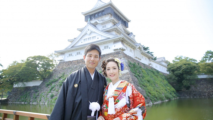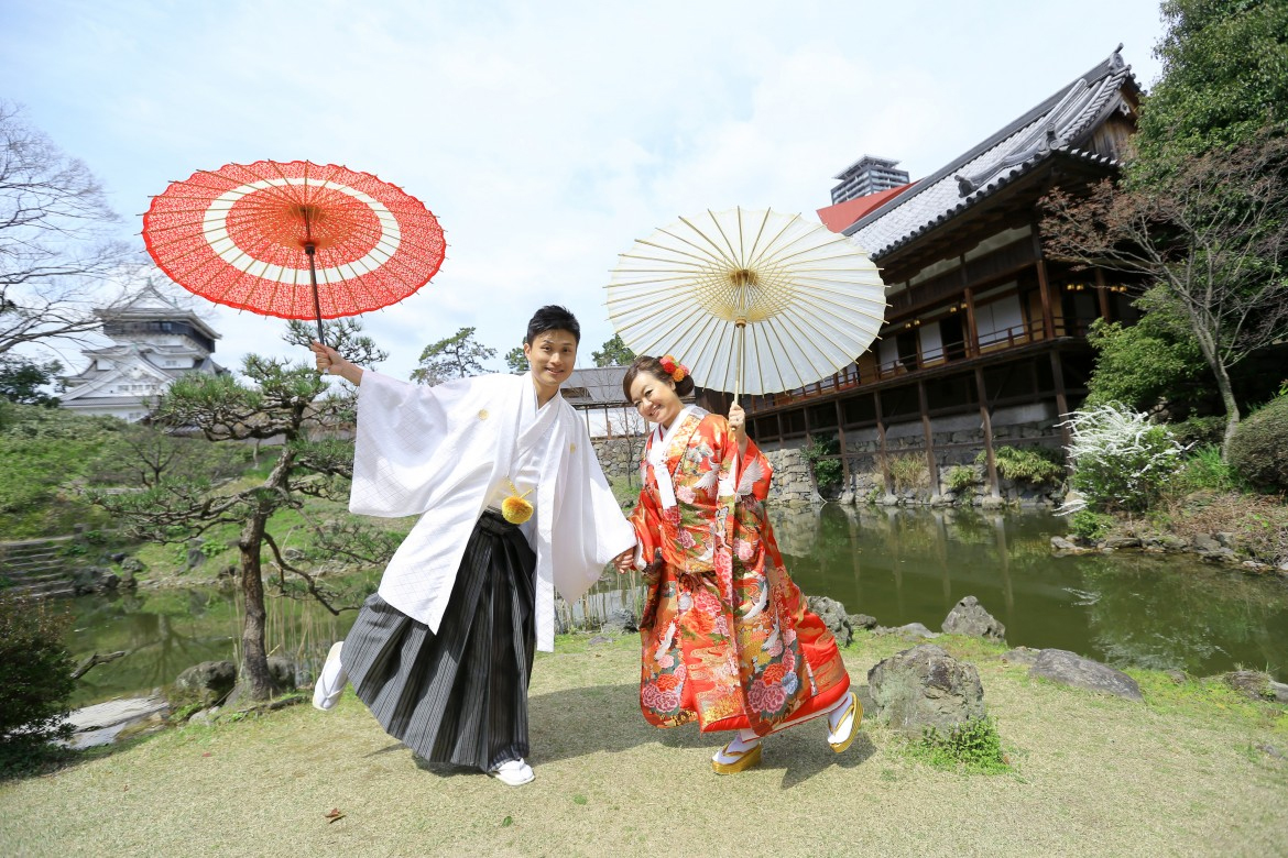 白無垢と色打掛が着られる和装2着前撮りプランです。歴史ある小倉城を望む庭園での前撮りが楽しめます。